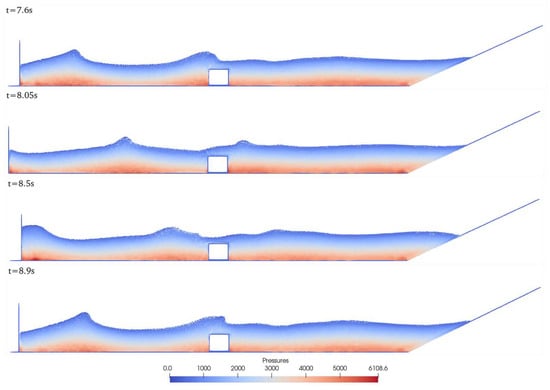 Through the discussion in the first two sections, we can select a structure with a length of 0.3 m and a width of 0.25 m. In this section, the interaction between deformed waves and structures is discussed under different wave conditions. Wave conditions 1 and 2 are selected with an amplitude of 0.1 m and a period of 1.0 s, 1.2 s, respectively. When the amplitude of the wave remains constant, the period and the duration of the deformed wave are longer, as shown in Figure 15. A pressure graph with a wave amplitude of 0.1 m and a period of 1.2 s is shown in Figure 16.