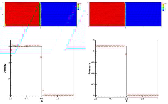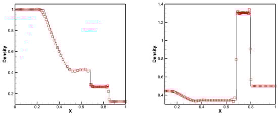 These two problems are calculated in the domain of with uniform initial cells. The density profiles of the Sod problem at and the Lax problem at are displayed in Figure 3. It can be seen that the designed scheme can obtain a sharp capture of discontinuities.