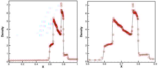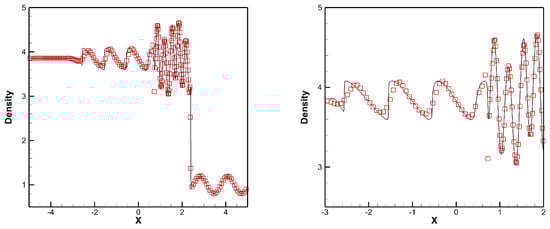 The computation domain is with a uniform cells initially. The final computing time is . The density ρ calculated by the designed scheme is presented in Figure 4, where the reference solution is the results of the fifth-order Eulerian WENO scheme [] with 2000 cells. It can be seen that the developed scheme obtains the desirable results in a fine structure of density profile.
