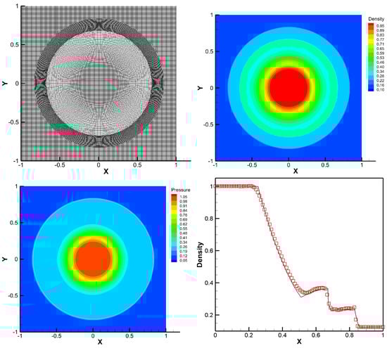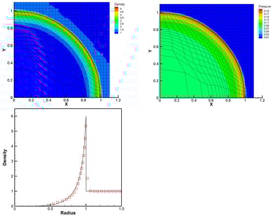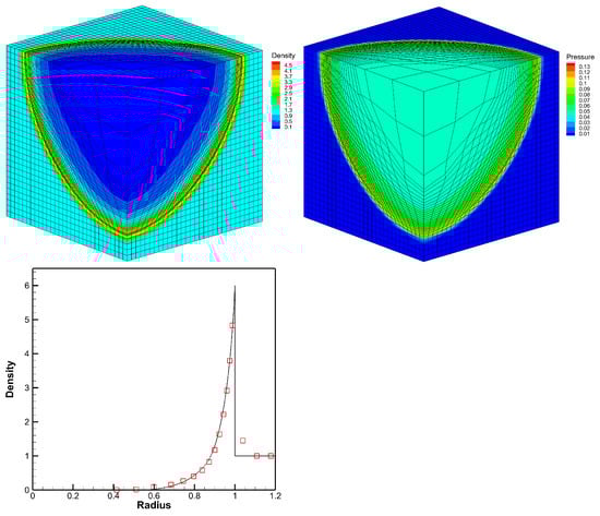 The computation is performed on with uniform cells. The symmetric boundary conditions are employed on , , and , and other boundaries are defined as non-reflective. The computation results of density and pressure distributions and their profiles against radius are presented in Figure 13. The designed scheme also performs well, as before.