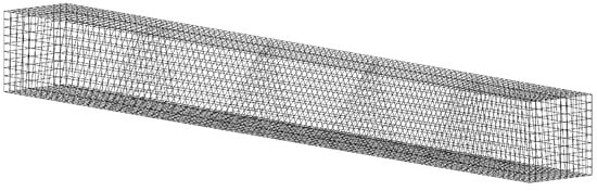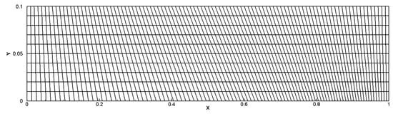 The three-dimensional Saltzman problem [] is considered to evaluate the robustness of the Lagrangian method, which describes the motion of a planar shock wave on a skewed cartesian grid. The computation is carried out in with cells. The initial mesh is displayed in Figure 14 and given by