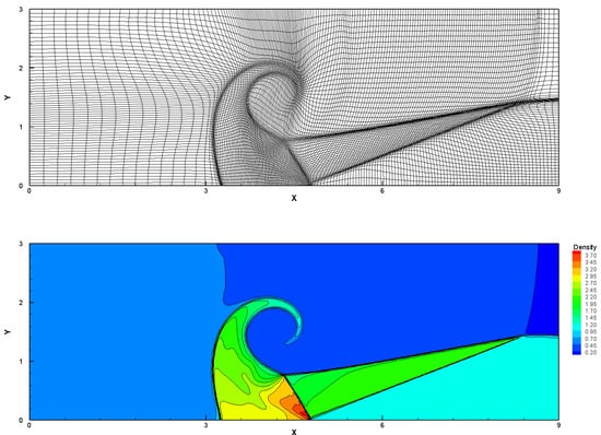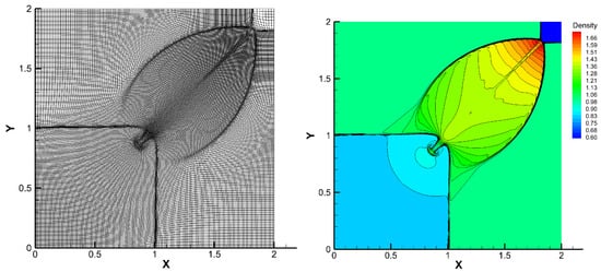 Initially, cells are equally distributed. The final computing time is . In this case, we perform the rezoning and remapping algorithm every five-time Lagrangian steps. As in [], the monitor function used here is . The results of mesh distributions and density contours are shown in Figure 11. It can be observed that the mesh is performed well and desirable results are obtained by the proposed scheme combined with the rezoning and remapping algorithm.