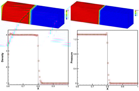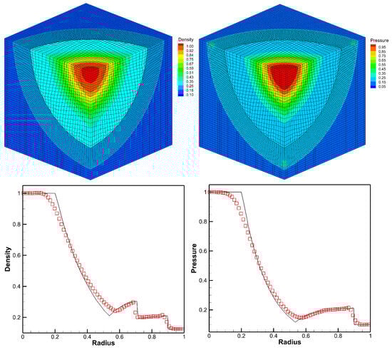 The three-dimensional Sedov problem [,,], which describes blast wave energy deposited from a singular point, is a typical test problem for the Lagrangian method. The initial conditions are , and the pressure is everywhere except in the cell containing the origin. For the cell containing the origin, the pressure is given by , where is the total amount of released energy, and V is the cell’s volume. The total energy released is given to make the shock arrive at when time []. The computation is performed on the domain of with uniform cells initially. The reflective boundary conditions are performed on , , and , and other boundaries are non-reflective boundaries. In particular, a smaller CFL number of 0.01 is used first and returns to 0.6 after 30 steps for the singularity of origin. The computation results of the designed scheme are given in Figure 12. The figure shows that the distributions of density and pressure perform well with mesh movement.