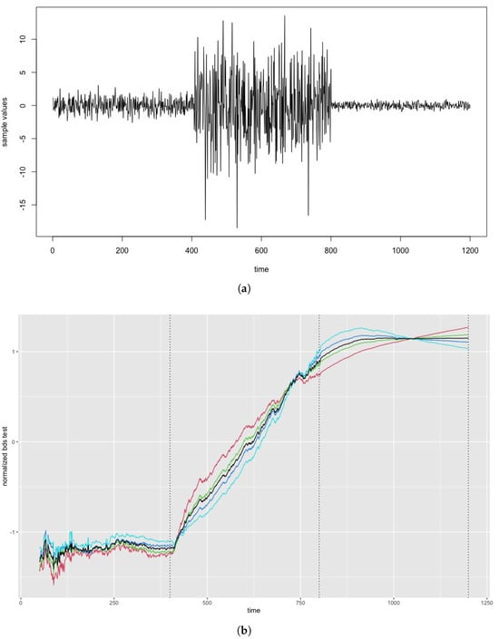 To illustrate the ability of this method to detect structural breaks, we present a simple numerical example below. We simulate three samples of size 400 each from a normally and independently distributed process with a mean of 0 in all three cases, but with three different variances. More specifically, we simulate 400 data from the distributions , , and , respectively. The resulting aggregate time series of 1200 observations exhibits two structural breaks (at time 400 and time 800), as seen in Figure 1a.