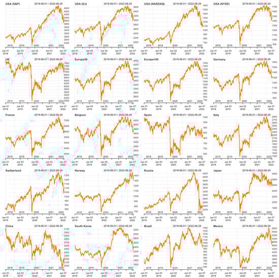 Graphical representation of the time evolution of the top 20 world stock markets over the last 5 years. The values shown are daily closing price indices from June 2018 to June 2022.