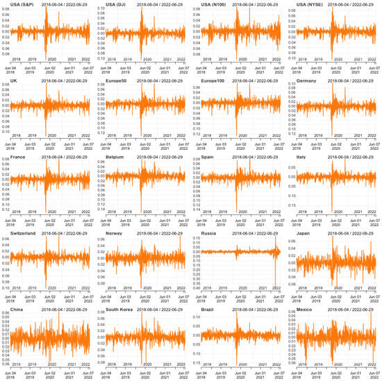 Table 2 presents the main descriptive statistics of the daily returns series of the 20 major stock market indices from June 2018 to June 2022. The results from this table show that for all stock markets, the mean returns are non-negative over this period. For some time series, e.g., USA (S&P), USA (NA), Norway (NO), or Brazil (BR), the returns are slightly positive, but the differences with zero means are not too clear. Initially, there are no significant differences among markets in return volatility (standard deviations), with the highest variability found in Brazil, Italy, and Russia (RU). Moving on to other descriptive statistics, skewness can be interpreted as a second (next to volatility) major proxy for measuring financial market stability. During the analyzed period, the return of all stock prices was negatively skewed, which means that there was a higher probability of large negative returns than positive returns. Based on the results of the kurtosis coefficients (K), we can conclude that the histograms of the daily return series for all stock indices are leptokurtic (). This means that the daily price fluctuations are more pronounced than estimated for the normal distribution. In this sense, the Jarque–Bera test rejects the null hypothesis that the return series follow a normal distribution.