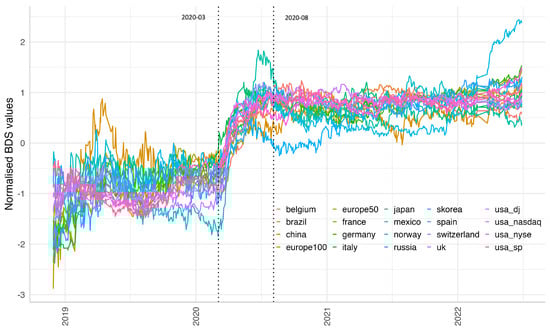 First, we estimate the RBDS time series Equation (6) using the daily returns in each stock market (Figure 4) We use the bds.test function in the tseries R-library []. To run the RBDS algorithm, we need to choose a concrete value for m, , , and , the parameters involved in Equation (6). We set = 0.5 times the standard deviation of each original series, which is one of the values generally accepted as valid in the specific literature [,,]. We performed several tests estimating RBDS with = 50, 10, 5, and 1, and no significant changes in the results were observed in terms of detecting structural changes in the selected financial time series analyzed. For this reason, without loss of generality and since we are using daily series of stock market indices, we decided to estimate the BDS every day, that is, with = 1. We started by estimating the BDS statistic for a first sub-sample of size = 50. We checked the stability of the first values estimated for the RBDS series ( = 50, = 51, = 52, = 53…) to avoid problems in estimating the BDS statistic with the sorted time series. Then, the procedure to obtain the RBDS time series in Equation (6) began by the estimation of the BDS statistic Equation (3) with a sample of = 50 daily observations and repetition of the BDS estimates by adding = 1 data to the sample in each iteration. For each return time series, we estimated five RBDS time series (embedding dimensions m = 2 to m = 6). Each of these RBDS time series was standardized, and, finally, for each stock market, we obtained the mean time series of the five standardized (Z-score) RBDS time series (m ranging from two to six), that is, the RBDS series used to check for structural change in each stock market.