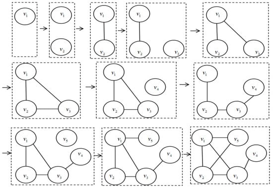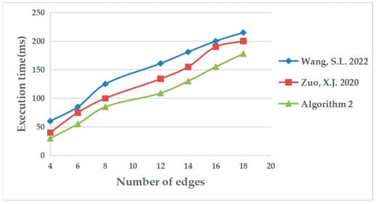 In this experiment, all other things being equal, the number of edges in the graph takes 4, 6, . , 18 for each and is tested in 1000 simulation experiments; the average of the algorithm execution time is counted (ignore preprocessing time in the algorithm). Figure 5 shows a comparison of the execution times of the algorithms in References [15,16] and Algorithm 2 of this paper as the number of edges increases, where the vertical coordinates indicate the time taken (milliseconds) and the horizontal coordinates indicate the different number of edges. As shown in Figure 6, Algorithm 2 takes less time than the other algorithms as the number of edges of the graph increases.