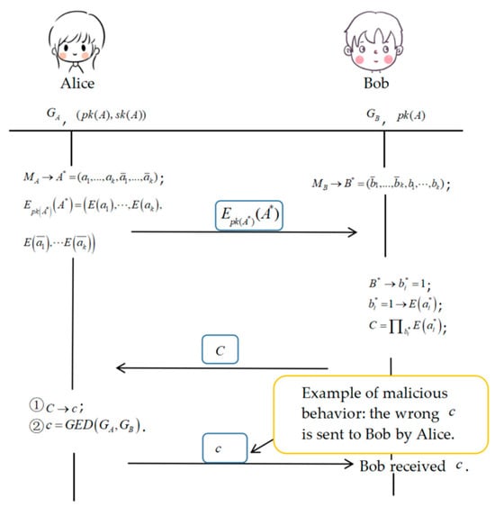 - In step (5) of Algorithm 1, Alice told Bob the wrong result after decryption, causing him to draw the wrong conclusion. The solution is to request equal status and generate their respective public and private keys at the same time, and in the algorithm, Alice and Bob decrypt the computation results separately to obtain the editing distance of the graphs, and finally both parties compute the correct result.