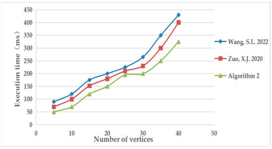 Execution time pattern with increasing number of vertices. (Reference [15]: Wang, S.L. 2022, Reference [16]: Zuo, X.J. 2020).