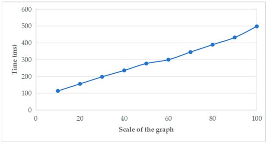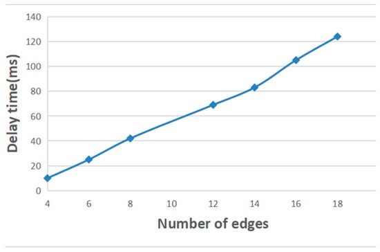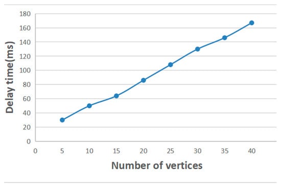 To more fully evaluate the performance of Algorithm 2, communication interaction experiments are conducted based on the previous experiments. The number of vertices and edges of the simulated graph is increased to determine the possible delay time in the execution of Algorithm 2. The delay time affects the efficiency of the algorithm execution, but it is not considered in the previous experimental evaluation. The relationship between delay time and the number of graph vertices is shown in Figure 7, and the relationship with the number of graph edges is shown in Figure 8.