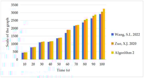 In order to evaluate the performance of Algorithm 2 more comprehensively, we conducted experiments on processing scales based on the previous experiments. The performance of Algorithm 2 is evaluated more explicitly by looking at the number of scales comparing the literature and the number of processing graphs of Algorithm 2, while time remains constant. This is shown in Figure 9.