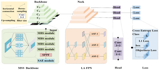 As shown in the Neck part of the overall architecture in Figure 1, different levels of low-, middle-, and top-level features are extracted in the bottom-up feature extraction process of the backbone network. For feature fusion, low-level features are first fed into the feature pyramid network, and then high-level features are gradually added. If feature fusion is performed directly, the fusion effect of non-adjacent level features will be poor, because the semantic gap between non-adjacent level features is larger than the semantic gap between adjacent level features, especially the bottom and top features. Therefore, an asymptotic architecture is adopted to first fuse two adjacent low-level features, and then gradually incorporates mid-level features and top-level features into the fusion process. In the process of multi-level feature fusion, ASF is used to assign different spatial weights to features at different levels, which enhances the importance of key levels and alleviates the impact of conflicting information on different targets.