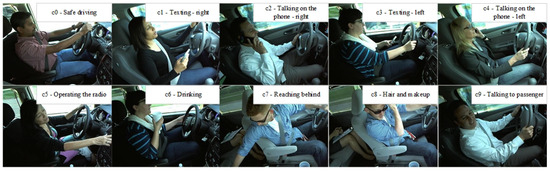 As shown in Figure 4, the StateFarm dataset contains ten categories, namely safe driving (c0), texting—right (c1), talking on the phone—right (c2), texting—left (c3), talking on the phone—left (c4), operating the radio (c5), drinking (c6), reaching behind (c7), doing hair and makeup (c8) and talking to the passenger(s) (c9). The specified 22,424 images and 67,272 images processed with offline data augmentation (i.e., Gaussian blur, Gaussian noise, and CutMix [31]) were used for training. Since the 79,726 images officially provided for testing were not labeled, approximately 1000 images in each category of images used for network performance evaluation were labeled in this study.