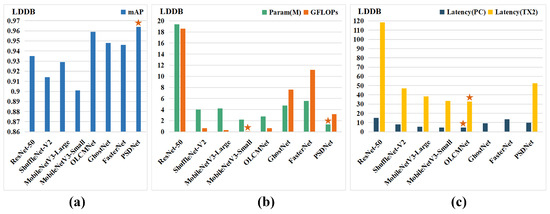 Figure 5 shows the corresponding results for a more accurate comparison. Figure 5a–c depicts the performance of various detection methods in terms of accuracy, weight and speed. In each case, the best performing method is marked with an asterisk on the corresponding column. The proposed scalable network PSDNet shows an excellent performance in terms of detection accuracy on the LDDB dataset, with an average accuracy of 96.4%. Furthermore, the number of parameters and computational complexity of this model are comparable to other lightweight networks with 1.33 M parameters and 3.2 GFLOPS computation.
