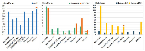 Table 2 shows the comparison of the proposed PSDNet network with other networks on the StateFarm dataset. The optimal values have been presented in bold, where the MAP column is labeled with the highest accuracy. Notably, we have further emphasized the minimum number of parameters and computations, which highlights the degree of lightness of the model. Additionally, we have bolded the lowest latency, which is a direct reflection of the high speed of the network when it comes to actual inference. These bolded values not only highlight the model’s superior performance in terms of accuracy, but also its outstanding properties in terms of lightweight and efficient reasoning. The results show that the proposed PSDNet exhibits the same advantages in terms of accuracy and computational complexity on the StateFarm dataset, and has an excellent detection speed on both cloud platforms and edge devices. The corresponding indicators of accuracy, model parameters with computation and detection speed are shown in Figure 7.
