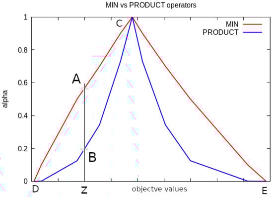An illustration of the results summarized by Proposition 2 can be seen in Figure 1: the membership function of the fuzzy set solution derived using the “product” operator is shown in blue, while the membership function of the corresponding fuzzy set solution derived using the “min” operator is shown in red. Point A has the coordinates , point B has the coordinates , segment is the support of both membership functions, and point C is the point with maximal amplitude for both membership functions.