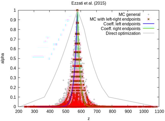 - The empiric solution provided by the general MC algorithm (in gray) better covers the exact fuzzy set representing the optimal solution when compared to the left–right-endpoint-based MC algorithm (in red);