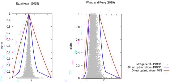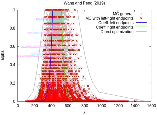 Figure 2 presents the results obtained using the “product” operator to model the conjunction. On the abscissa, the optimal objective values z are represented, while the ordinate is devoted to the -levels. The general MC simulation algorithm was run 100 times for each with . On the other side, the improved MC algorithm with left-right endpoints was run 10 times for each with . Note that the improved MC algorithm was able to cover the same area with 10 times fewer random generations.