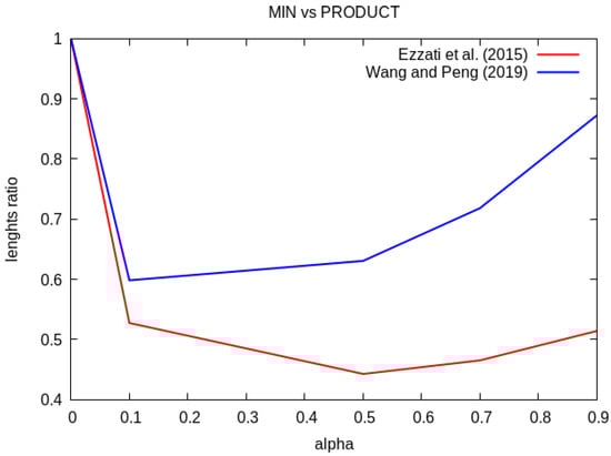 The last column of Table 2 provides the ratio between the lengths of the -cut intervals of the solutions obtained with the “product” and “min” operators, respectively. For both examples, the ratio has an ample decrease from 1 to and , respectively, when increases from 0 to (see Figure 5).