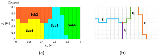 Figure 4. Plate substructured by METIS. (a) Plate with 4 design variables; (b) localized interfaces.