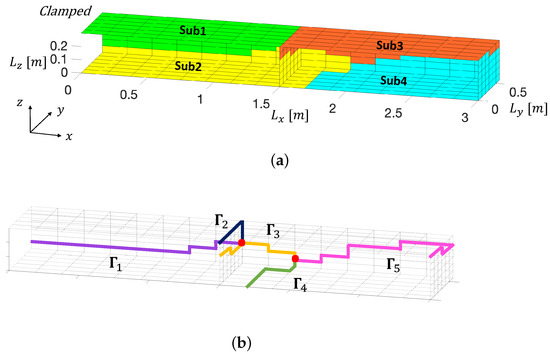 Figure 8. Box–beam substructured by METIS. (a) Box–beam with 4 design variables; (b) localized interfaces.
