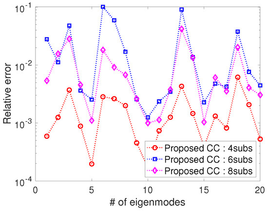 The range of CC modes computation is an important factor in obtaining guaranteed accuracy. The reduction basis for a jth interface (15) contains other interface sets dependent on synthesized substructures. In Figure 2, for example, Γ j , 1 , Γ j , 2 , Γ j , 3 , Γ j , 4 are uncompleted interface sets, and connected to substructures consist of Γ j :