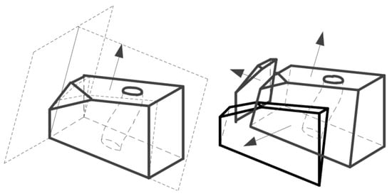As shown in Figure 5, two planes are created perpendicular to the base plane, passing through the two corresponding edges at the bottom, and the sub-model is partitioned again into three pieces. For the largest one, the part can be sliced through the normal direction of its base plane, and for the two small ones, they can be sliced through the normal direction of the newly created partitioning planes. In the LMD processes, these three parts can be constructed using multi-axis 3D printing equipment, without any support structures. And then all those partitions can be constructed one by one without any soldering process.