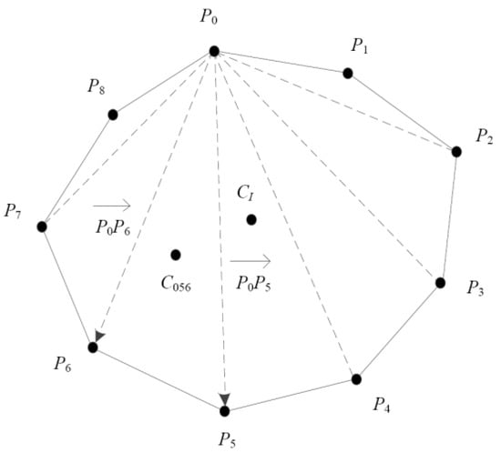 In an “stl” file, all surfaces are approximated by finite triangle facets, so the intersectional profiles are also composed by segments in the intersecting plane, as shown in Figure 10; an intersection profile has finite vertices such as (P0, P1, P2,…, Pm). Then, the mass center CI of the profile P0P1P2P3P4P5P6P7P8 can be acquired through two steps: (1) calculate the mass centers C0i(i+1) of all the triangles in Figure 10; (2) perform weighted calculations for all C0i(i+1) values by each corresponding triangle size. The calculation steps can be presented as Equation (20).