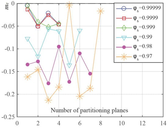 According to Figure 13, when Φs was set to smaller values, more partitioning planes were finally acquired, and during the whole process, smaller mc values were achieved. In contrast, if Φs was set to values closer to 1.0, fewer partitioning planes could be generated and greater mc values closer to 0.0 could be achieved.