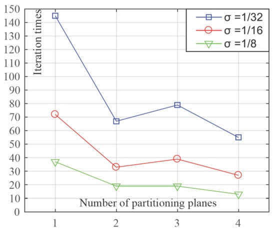 On the other hand, from Figure 14, the value of σ influenced the total number of iteration steps for acquiring the same partitioning plane. It is clear that when σ was reduced to half its value, the total number of iteration steps would be doubled for calculating the same plane, causing more calculation time to be spent.