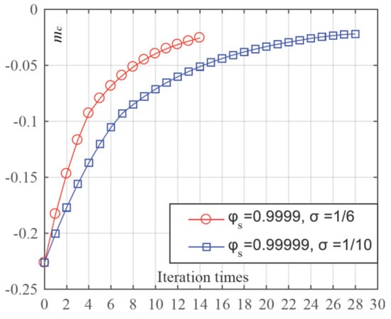 As shown in Figure 15, the value of Φ increased sharply at about the first 1/4 of the total iteration steps, and then this acceleration decreased to quite a small value, increasing the Φ value little by little until the desired value of Φs was exceeded. Also, Figure 16 indicates that the increasing speed of the mc value would slow down with the increase in the iteration steps, and, finally, mc would converge.
