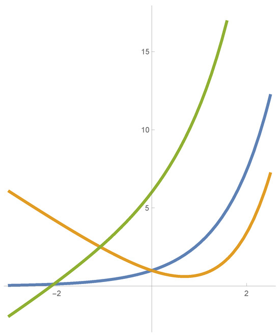 Congruent curves in : , , (blue, orange, and green, respectively).