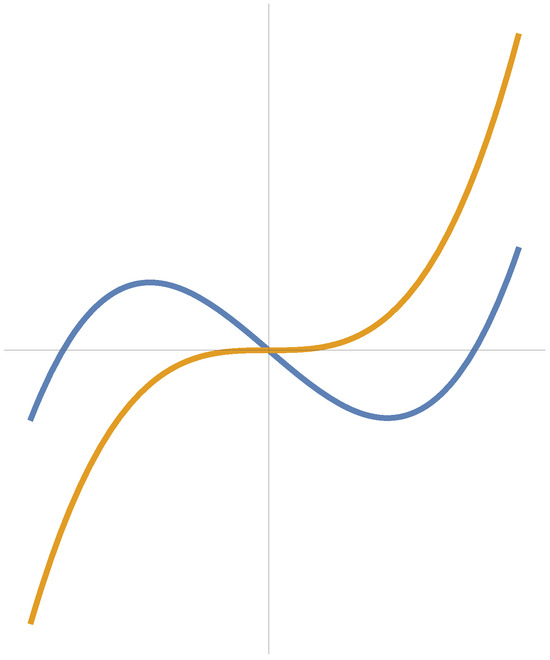 Congruent clothoides in as presentations of a pseudo-null curve in Example 3 in two orthonormal frames (blue curve in the first local frame, orange in the second).