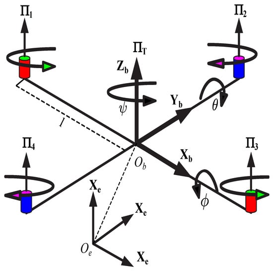 The quadrotor provides six outputs in its translational and rotational motions. Four actual voltage inputs drive these outputs. The earth-fixed frame and the body frames are represented by and , respectively. The quadrotor dynamics can be expressed using the Newton–Euler formalism as follows [7,33].