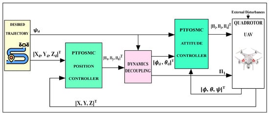 Quadrotors have grown in popularity in recent years as a result of rapid technical advancement, which has had a considerable impact on current electronic components, such as microcontrollers, sensors, and low-cost development. These advancements work in favor of this platform, propelling it to mainstream status. Many researchers have tackled the topic of trajectory tracking of quadrotor systems in the past decade due to the numerous applications of this vehicle [1,2], including military, highway monitoring [3], photography and videography, geographic mapping of inaccessible terrain and locations, delivery systems [4], surveillance [5], detection, scientific research and development, identification of different objects, search and rescue missions [6], and agriculture. The dynamics of the quadrotor system in real flight involve parameter uncertainty and external disturbances, which negatively impact stabilization and tracking performance. Different control methods have been developed to address these challenges, particularly sliding mode control (SMC) and advanced control systems based on SMC, such as nonsingular fast terminal SMC [7], fixed-time distributed robust SMC [8], adaptive backstepping fast terminal SMC [9], developing PID in sliding mode controllers [10], etc.