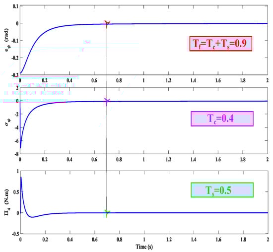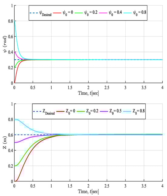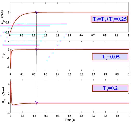 The response of the quadrotor system provides evidence that the suggested controller induces a fast response. It should also be noted that there is an upper constraint on the convergence time, which can be predefined as an adjustable control parameter and is independent of the initial conditions, as shown in Figure 14.