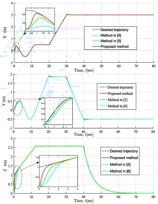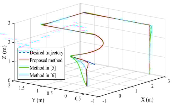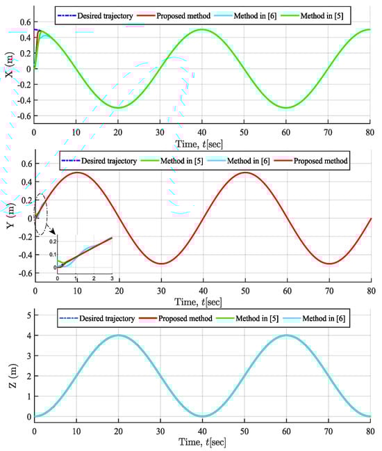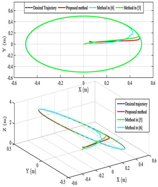 In this case, the quadrotor tracks the desired reference without external disturbances. Equation (63) provides more particular information about the desired trajectory.