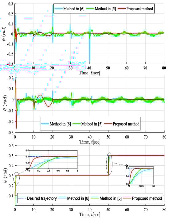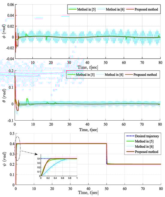 To further evaluate the effectiveness of the PTFOSMC method, the disturbances mentioned in scenario 2 are added to all state variables. In the current case, the initial conditions are changed; for the yaw subsystem, rad, rad, and rad, for the z-subsystem, m, m, m, and m.