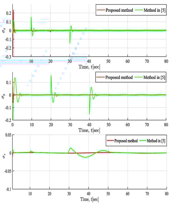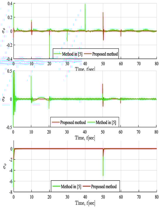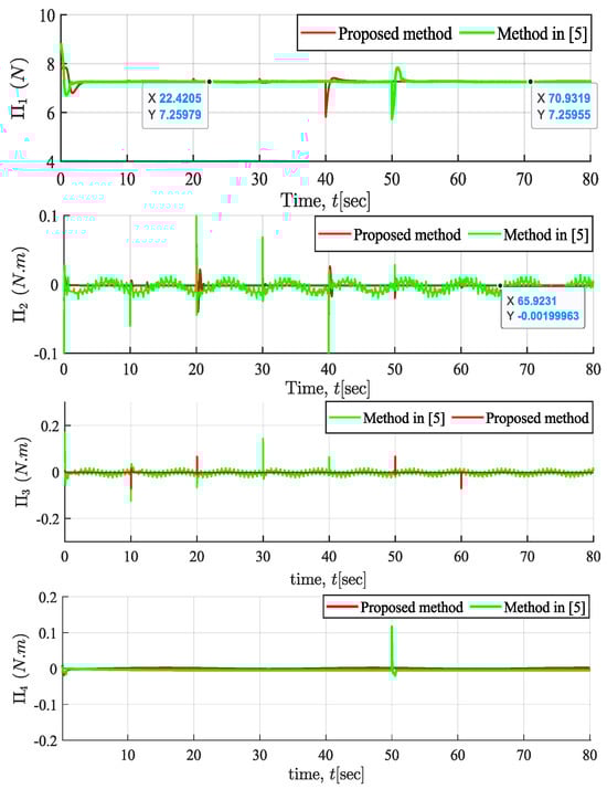 Table 4 presents the ISV comparative results for the inputs of a quadrotor. It is clear that the performance index values for the proposed control methodology are significantly lower than those for the alternative strategy. The tracking performance of the suggested control approach is then found to be better than that of the method of [9,10] by comparing the simulation results.