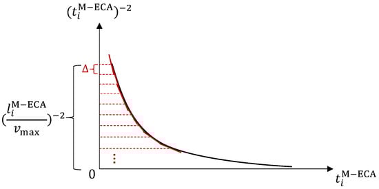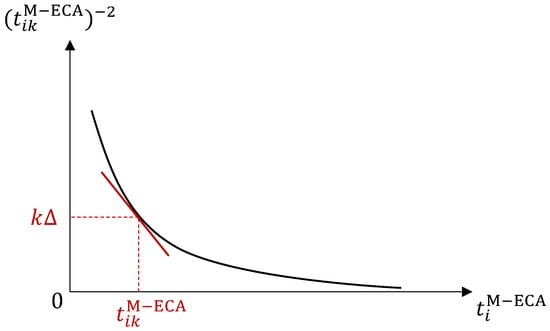 The objective function of model [M2-EE] contains nonlinear terms, which is hard to solve by the off-the-shelf optimization solvers. Specifically, the objective function of model [M2-EE] contains the sum of four nonlinear functions, and we show one of them in Figure 1. Referring to [36,37], we generate piecewise-linear functions to approximate the nonlinear function. Advanced piecewise linearization techniques, utilizing Special Ordered Sets of type 2 (SOS2) constraints, have been employed to approximate the nonlinear functions within the optimization problem. This approach has been used to mitigate complexity, transforming the mixed-integer nonlinear programming (MINLP) model into a mixed-integer linear programming (MILP) model [38]. The primary objective is to enhance the convergence rate and reduce the computational time required during the solving process. Irion et al. [39] has developed a sophisticated optimization model for shelf-space allocation, which accounts for in-store costs and considers various factors like space and cross-elasticities. To simplify this complex nonlinear model, a piecewise linearization technique was employed, converting it into a linear mixed-integer programming (MIP) problem. The results of numerical experiments demonstrate the competitiveness of this method when compared to traditional mixed integer nonlinear programming models. Emmanuel and Dimitrios [38] originally proposed MINLP formulations for optimizing production in a synthetic oil field. By utilizing a piecewise linearization technique, these formulations were transformed into MILP models, leading to improved solving efficiency. The benefits of this MILP reformulation were explored across three case studies with varying complexity. Furthermore, Camponogara et al. [40] used a similar piecewise linearization approach to embed a well-fluid flow splitting model into an MILP formulation for production optimization. This technique has found widespread application in some publications [41,42]. We discretize the value of the objective function by . Figure 2 represents the piecewise-linear functions of . As the maximum value of sailing speed is , the maximum value of equals . Then, we can obtain the piecewise linear function based on each discretized point (see Figure 3 for an example). We use to denote the value of the piecewise linear function and we have . We have a total of intervals divided by (note that we assume is an integer because can be small enough). We use to denote each divided interval. For example, the first interval equals and the second interval equals . Therefore, model [M2-EE] can be transformed into the following model: