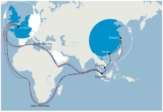 We have selected a route from Asia to northern Europe, specifically the route between Shanghai in China and Le Havre in France (https://www.cma-cgm.com/products-services/flyers, accessed on 1 September 2023). In the eastward direction, there are two options: one route passes through the Mediterranean, known as the SECA region, and the other route navigates around the Cape of Good Hope. Similarly, in the westward direction from Shanghai to Le Havre, there are two possibilities: one route takes the path through the Mediterranean, the SECA region, while the other option involves circumnavigating the Cape of Good Hope.