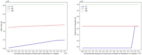 In a broader context, the total costs for all models increase with the rise of the weekly cost per ship c. Specifically, as c increases, the fixed cost of vessels continuously grows across all models. However, when the fixed cost per ship becomes excessively high, shipping companies reduce the number of vessels deployed. At this point, the variation in the fixed cost of vessels depends on the trade-off between the cost increase caused by rising ship unit prices and the cost reduction resulting from a decrease in the number of vessels. As indicated in Figure 7, there is a slight decline in the fixed cost of vessels when c reaches 680,000. Simultaneously, due to the reduction in the number of vessels, ships will augment their sailing speed to meet the required service frequency, resulting in an increase in fuel costs, as demonstrated by the rise in MGO costs for the EE model in Figure 7. (Since the model [M3-EE] has already reached the maximum speed for LSFO sailing, its costs remain unaffected by changes in the number of vessels deployed.)
