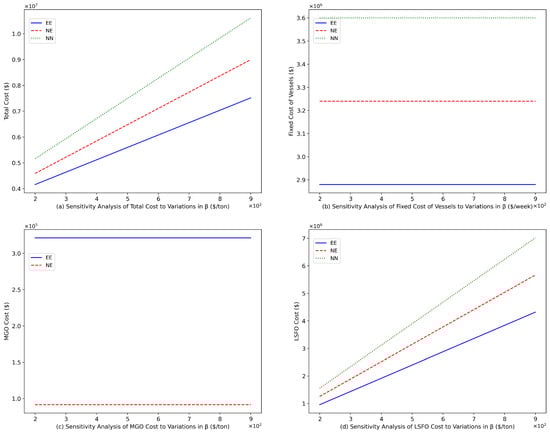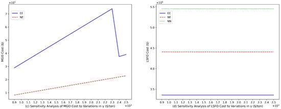 Within the framework of fundamental analysis, the deterministic assumption prescribes a fixed value of 700 dollars/ton for the LSFO price (). However, to incorporate the inherent volatility observed in real-world scenarios, this sensitivity analysis considers a range of values for , encompassing a spectrum from $200 to $900 per ton. Computational results are summarized in Figure 6.