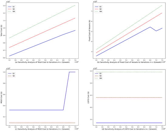 This study specifically focuses on investigating the impact of the weekly fixed cost per ship on operational decisions. A predetermined value of $360,000 is initially assigned to the weekly fixed cost per ship. However, it should be noted that the value of c is subject to significant variations due to various factors, such as the repercussions of epidemics or unforeseen circumstances, and it may even experience increasing prices owing to technological advancements, such as becoming equipped with advanced scrubbers [33]. Consequently, a range of values for c is defined, spanning from 340,000 to 600,000 dollars, and the corresponding outcomes are documented in Figure 7.