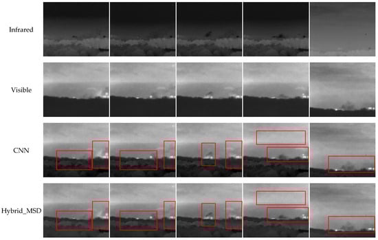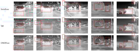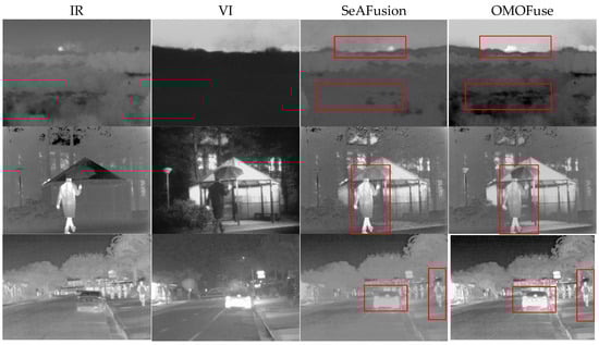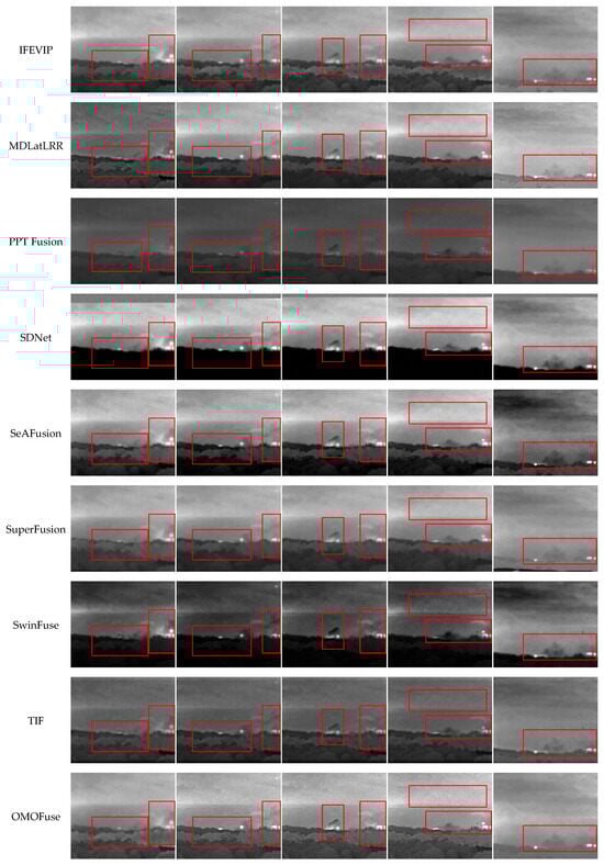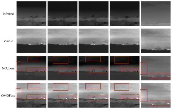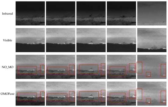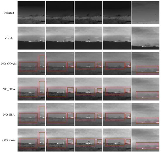 Figure 12 represents the qualitative comparison of the ablation study performed on each section of the ODAM module. As we can discern from Figure 12, despite that NO_MO performs better in terms of clarity of “trees”, it still lags behind the OMOFuse algorithm. Furthermore, the clarity of all “fire points” is consistently better with the OMOFuse algorithm than with NO_MO, with sharper “flames” visible on the right side. This further demonstrates that the MO module can enhance the visual performance of the algorithm to a certain extent.