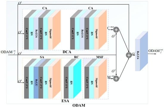 Our ODAM algorithm module, as Figure 2 illustrates, predominantly comprises of a parallel connection between the DCA (dual-channel attention) module and the ESA (enhanced spatial attention) module. The input image, designated as , is initially divided into four branches . Among these, undergoes processing through two CA (channel attention) mechanisms [43], linked in a series to form the aforementioned DCA. The main aim of the DCA process is to extract information efficiently from the channel dimensions of the feature maps, with the output being labeled as after completing the DCA processing. Meanwhile, another branch, , proceeds sequentially through the SA (spatial attention) module [44], followed by an RC (residual connection) [45], and ultimately the MSF (multi-scale fusion) [46], culminating in an output of . The ESA module, composed of three sub-modules, namely, SA, RC, and MSF, further enhances the extraction of infrared and visible light information on the spatial dimension. All extracted infrared and visible light information are summed in terms of dimension to ultimately obtain , which is then nonlinearized by the ReLU6 [47] activation function to yield the output value, denoted as . The crucial role of the ODAM module is to further enhance the network’s infrared and visible light feature extraction capability on both the channel and spatial dimensions for the incoming image . Equation (1) shows the final output, represented as , where signifies the addition of channels. Equation (2) illustrates the final output of the ODAM module, denoted as
