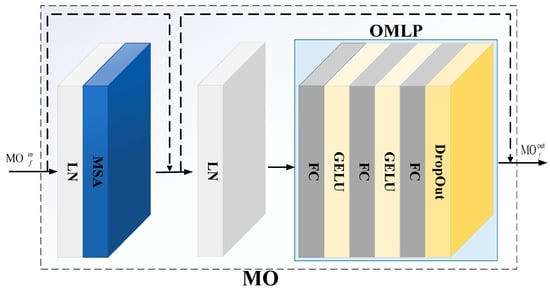 Figure 3 shows the structure of the MO (multi-head self-attention, optimized MLP) module; through the figure, we can know that the MO module mainly consists of OMLP (optimized multi-layer perceptron) and MSA (multi-head self-attention) [49]. Equation (8) expresses its formula: