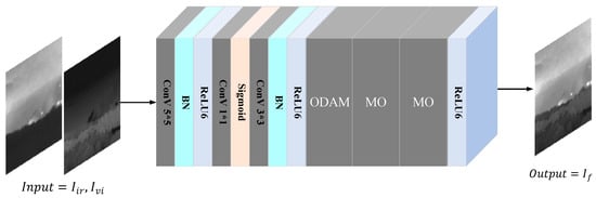 Figure 4 illustrates the structure of the OMOFuse network. The inputs are infrared () and visible light () images. These inputs sequentially pass through a convolutional layer with a 5 5 kernel, a BN layer, a ReLU6 layer, a convolutional layer with a 1 1 kernel, a Sigmoid layer, a convolutional layer with a 3 3 kernel, another BN layer, and another ReLU layer. Subsequently, the data passes through an ODAM module and two concatenated MO modules, finishing with a ReLU6 layer. The output is represented as . Through the simple configuration of the OMOFuse network, we achieved an efficient fusion of infrared and visible light of high-class significance.