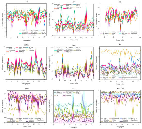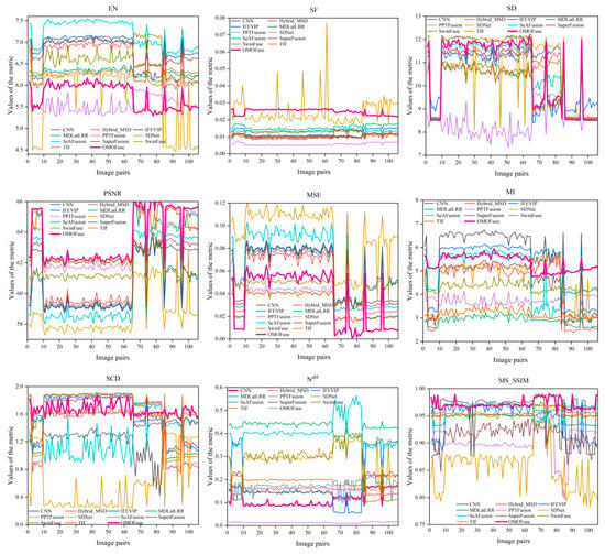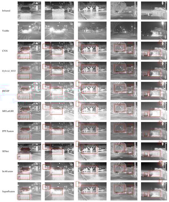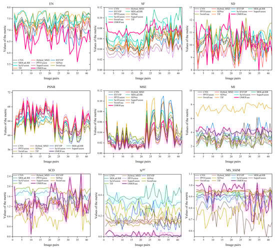 To ensure the objectivity and fairness of the experimental data, all our tests are carried out on an NVIDIA GeForce RTX 3080TI GPU using the PyTorch framework. Concurrently, the code for the experiment utilizes the author’s publicly disclosed parameter code, maintaining the original hyperparameters. Within the OMOFuse network, we have set the number of iterations to 100, the batch size to 24, and the initial learning rate to 1 × 10−2. For the data augmentation phase, the size is randomly center-cropped to 224 × 224, and mosaic data augmentation [51] has been applied. As the optimizer, we selected AdamW [52].